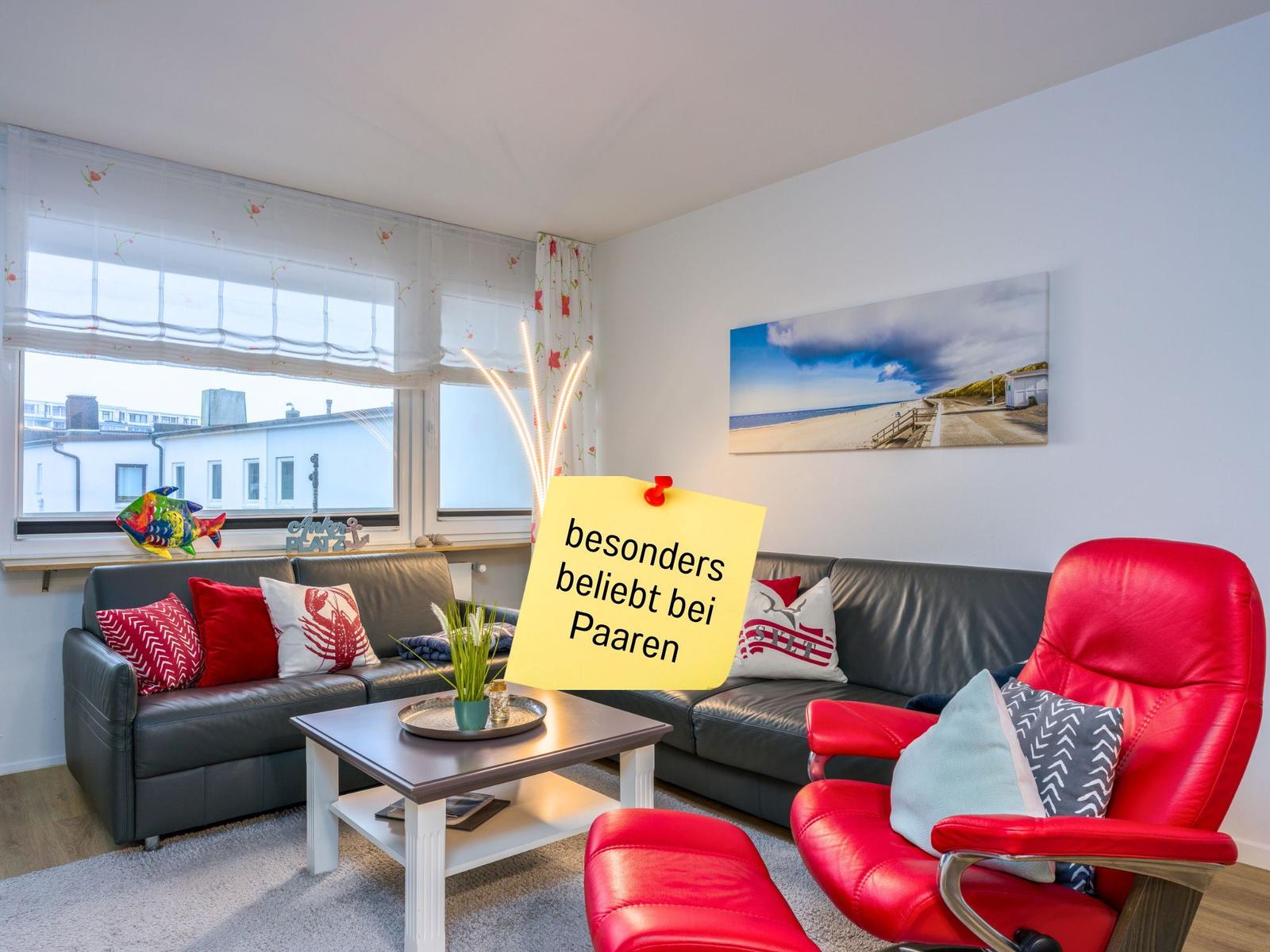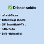 Die zentral gelegene, strandnahe und barrierefreie Ferienwohnung überzeugt Gäste durch ihre Sauberkeit sowie eine geschmackvolle Einrichtung, die ein sofortiges Wohlfühlen ermöglicht. Mehrere Besucher heben die lückenlose Küchenausstattung hervor, während rückenfreundliche Möbel und eine Infrarot-Sauna den Komfort ergänzen. Zudem wird der aufmerksame Kontakt zum Vermieter gelobt, der sich aktiv nach dem Wohlbefinden der Gäste erkundigt. Ein Gast hebt zudem hochwertige Balkonmöbel und einen antiken Eckschrank hervor. Ein Gast weist auf die fehlende Netzwerkverbindung der Smart-TVs sowie einen fehlenden Tiefgaragenplatz hin.