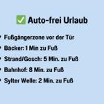 Sehr gute Ausstattung. Sehr zentrale Lage. Schöner Strand von Westerland in unmittelbarer Nähe. Ideal für die Erkundung der gesamten Insel, insbesondere mit dem Fahrrad. Alle Einrichtungen zur Versorgung und gute Restaurants in der Nachbarschaft.