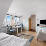 Via the entrance area with a spacious wardrobe, past the well-equipped kitchenette, you enter the tastefully furnished living/bedroom with its wonderful view over the picturesque Frisian houses of Rantum to the Wadden Sea. The southeast orientation gives the apartment a sun-drenched and cheerful ambience. The adjoining bathroom offers you a view as well of the North Sea and the Wadden Sea. The kitchen has a stove with 2 ring ceramic hob, refrigerator, coffee maker, kettle, toaster, egg cooker and crockery. The bright and invitingly tiled daylight bathroom has a bathtub with shower and a hair dryer. The sleeping area is furnished with two single beds, both electrically individually adjustable at the head and foot end. The living room is divided into a cozy dining area and a TV chair with a cupboard and a chest of drawers. TV, DVD, CD, radio and free WiFi are available. In the basement you can use the shared washing and drying room as well as the shared wellness area with swimming pool and sauna.