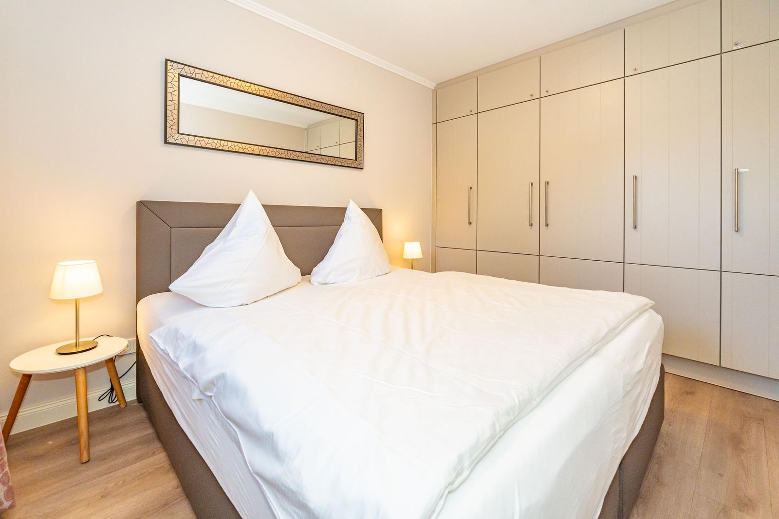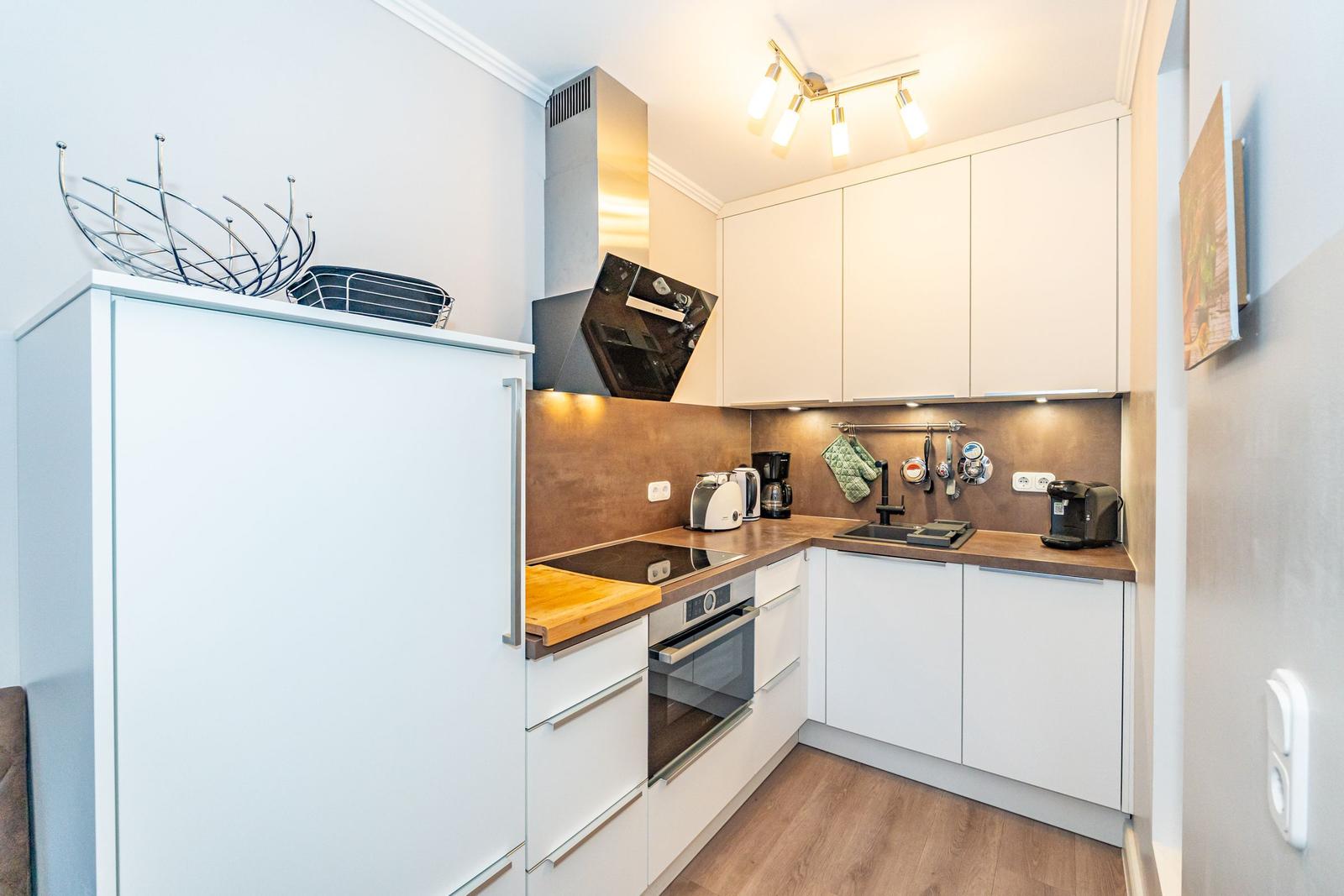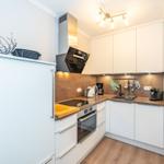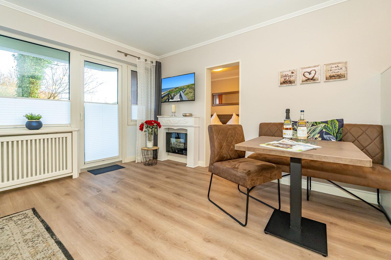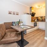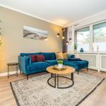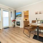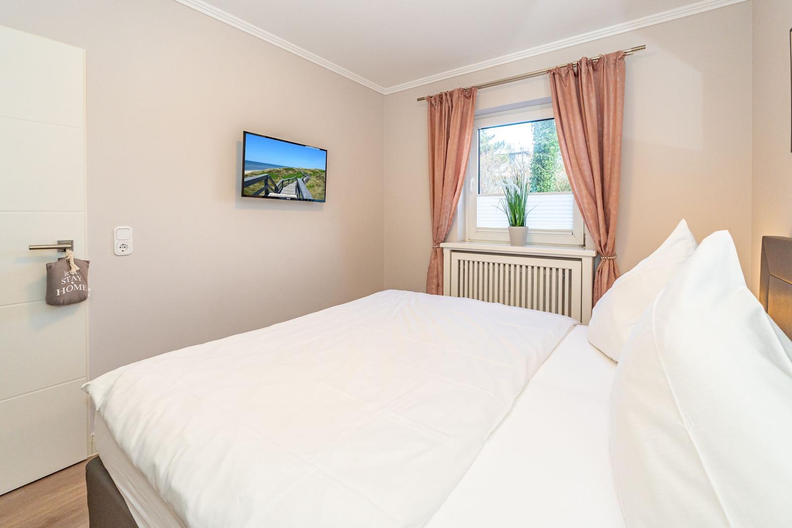 The Sünhair holiday apartment is located on the first floor of an apartment building in the heart of Westerland, Sylt. It features a modern design with a cozy living area, complete with a sofa corner and dining space. The open-plan kitchen is well-equipped with a ceramic hob, oven, refrigerator with freezer compartment, dishwasher, kettle, toaster, and coffee maker, allowing for easy self-catering. The separate bedroom includes a comfortable double bed (180x200 cm) and an additional television. The contemporary bathroom is fitted with a walk-in shower, sink, toilet, mirror, cosmetic mirror, hairdryer, and hot water. Guests have access to communal laundry facilities with a washing machine and dryer, located in the basement. A private parking space is available directly by the apartment. All windows are fitted with privacy screens, ensuring a comfortable stay.