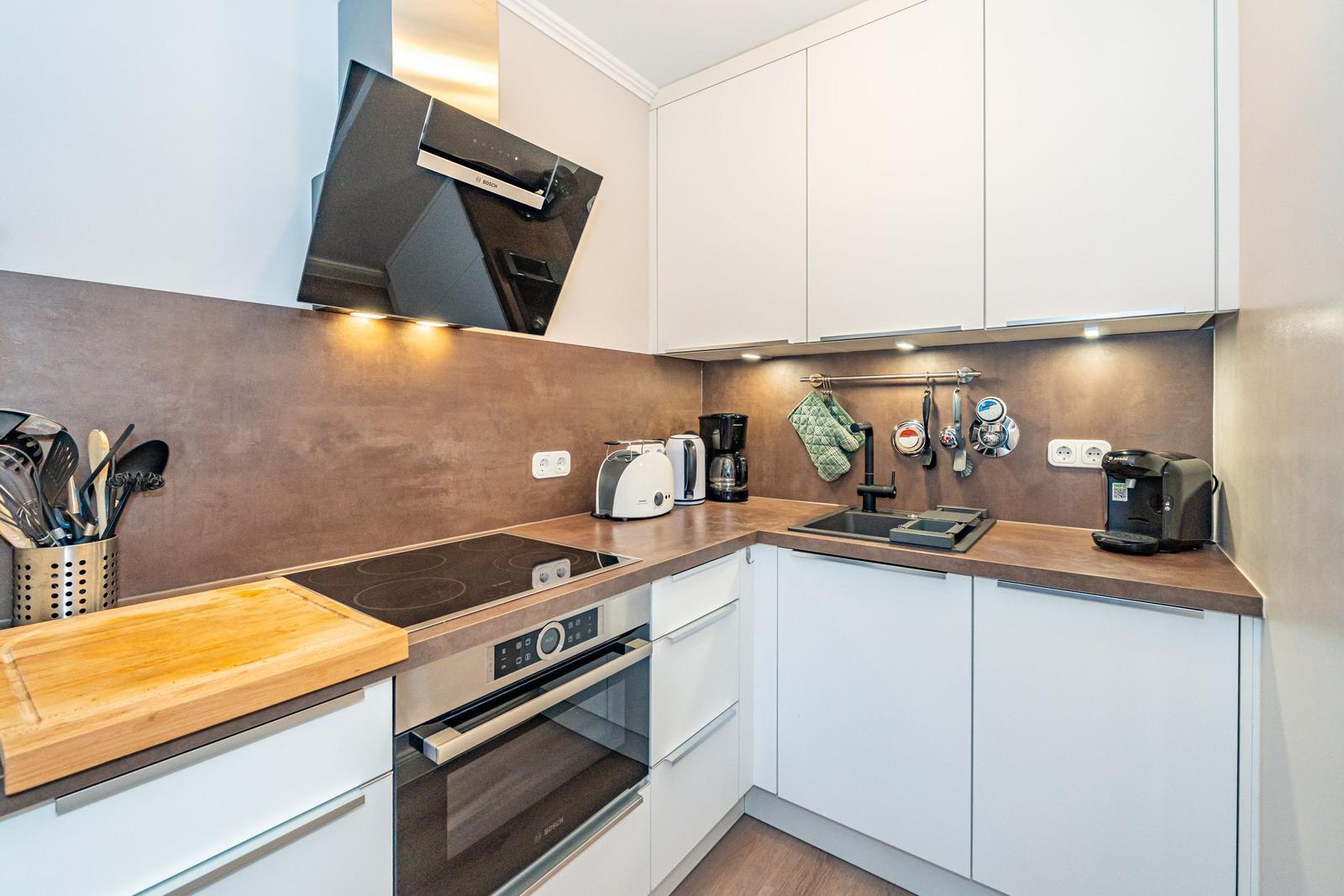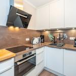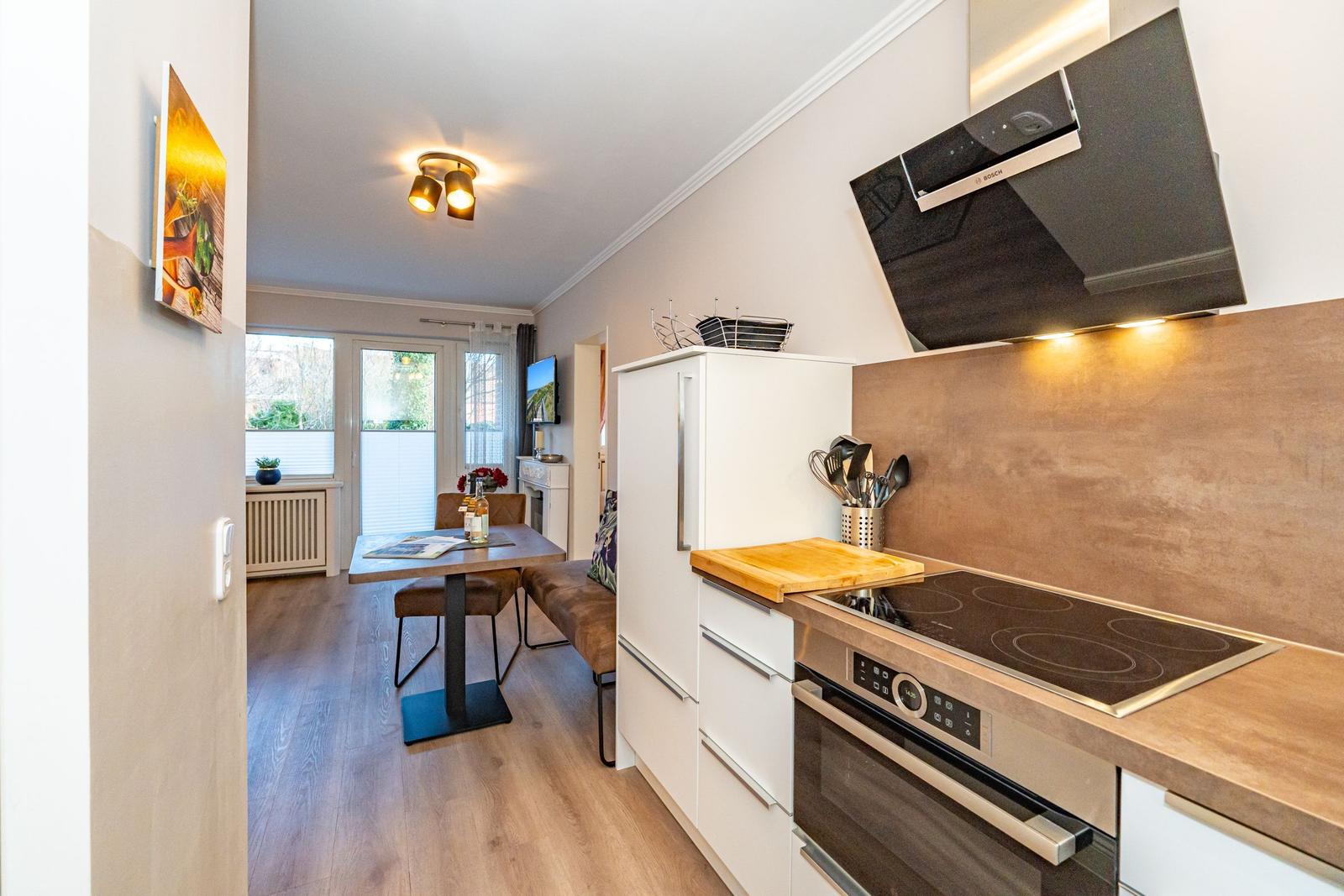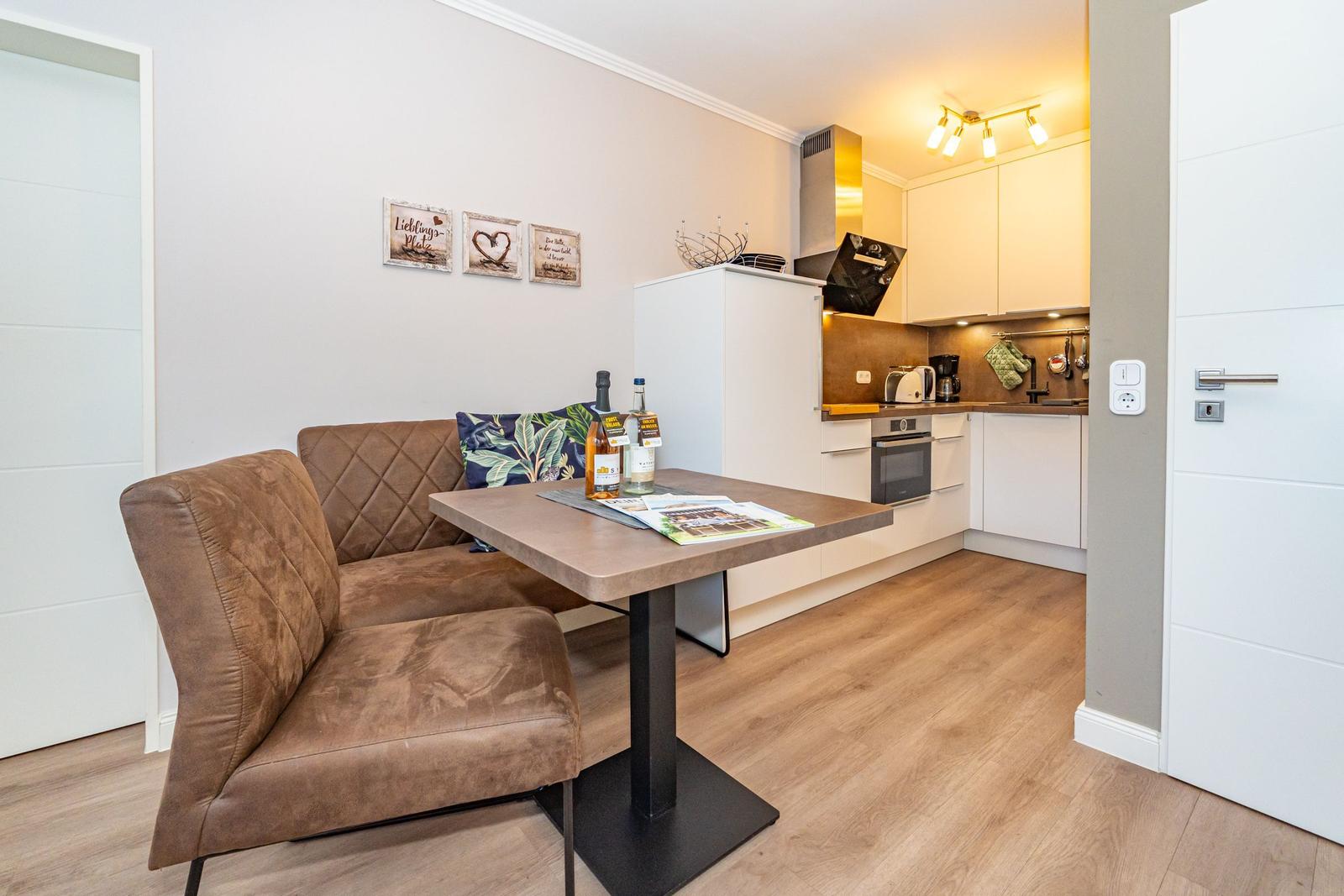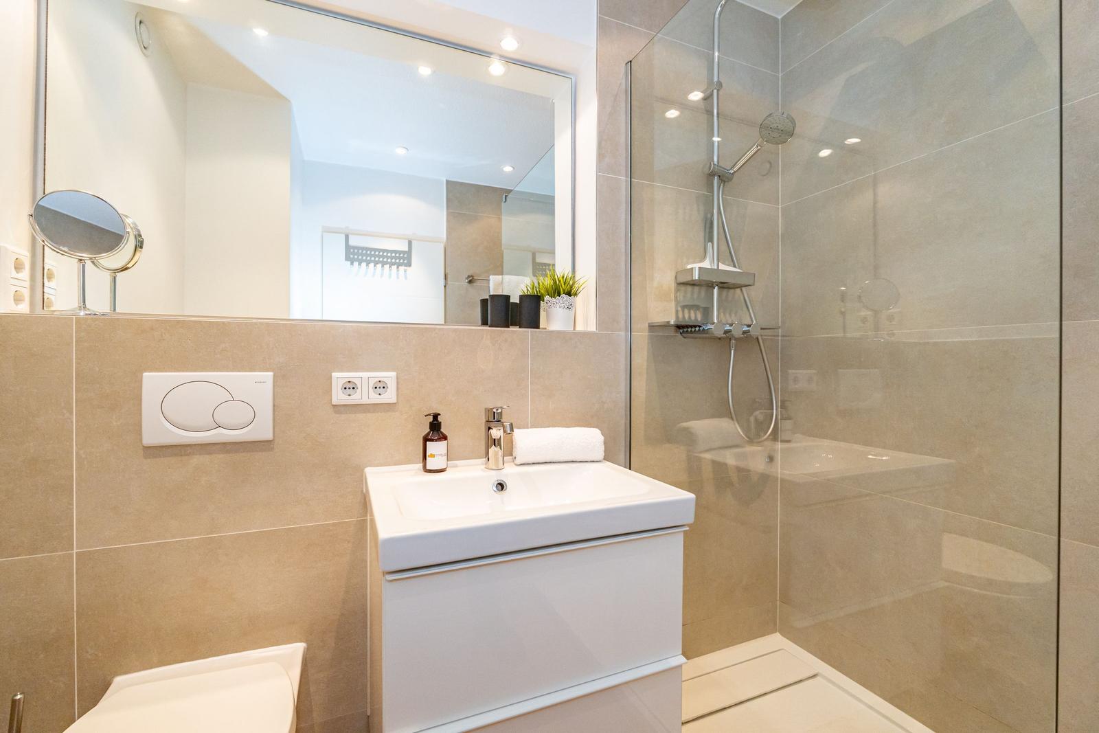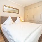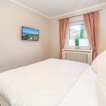 The Sünhair holiday apartment is located on the first floor of an apartment building in the heart of Westerland, Sylt. It features a modern design with a cozy living area, complete with a sofa corner and dining space. The open-plan kitchen is well-equipped with a ceramic hob, oven, refrigerator with freezer compartment, dishwasher, kettle, toaster, and coffee maker, allowing for easy self-catering. The separate bedroom includes a comfortable double bed (180x200 cm) and an additional television. The contemporary bathroom is fitted with a walk-in shower, sink, toilet, mirror, cosmetic mirror, hairdryer, and hot water. Guests have access to communal laundry facilities with a washing machine and dryer, located in the basement. A private parking space is available directly by the apartment. All windows are fitted with privacy screens, ensuring a comfortable stay.